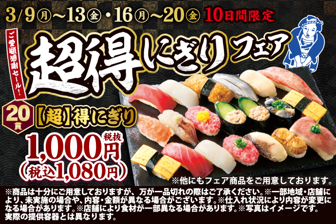 【超】得にぎり 20貫 1,000円(税込1,080円)