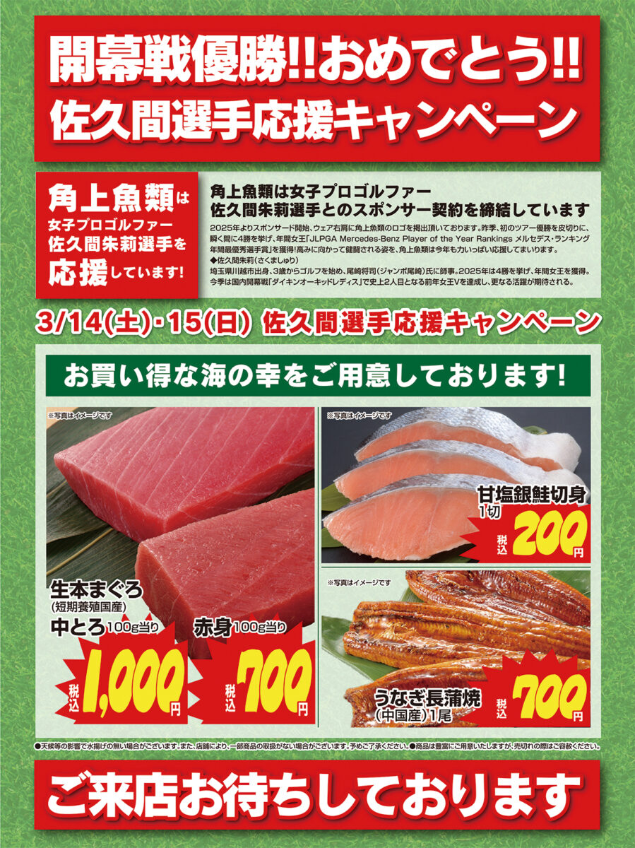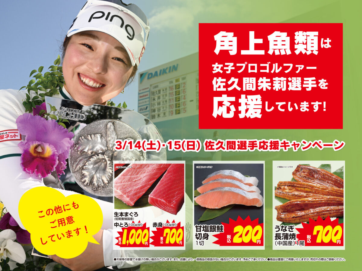 角上魚類ホールディングス株式会社(本社:新潟県長岡市寺泊下荒町、以下、角上魚類)では、スポンサー契約を締結している女子プロゴルファー佐久間朱莉選手の開幕戦勝利を祝し、3月14日(土)、15日(日) 応援キャンペーンを行います。