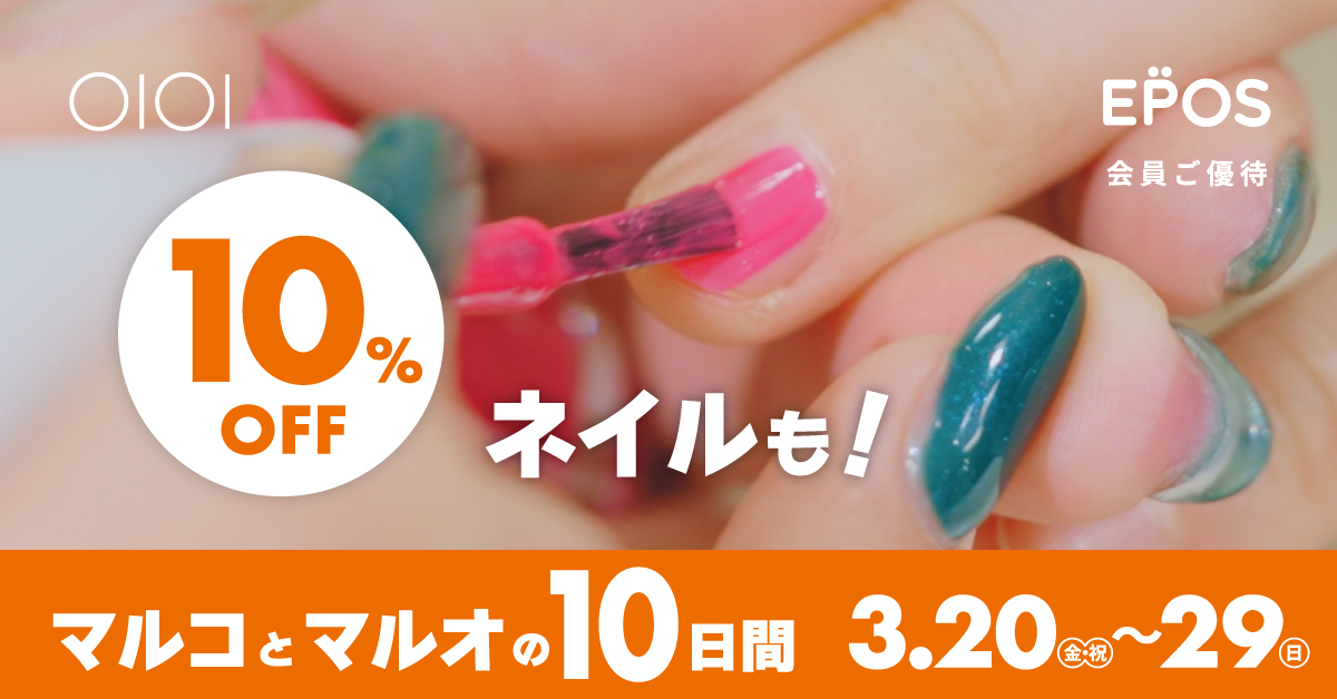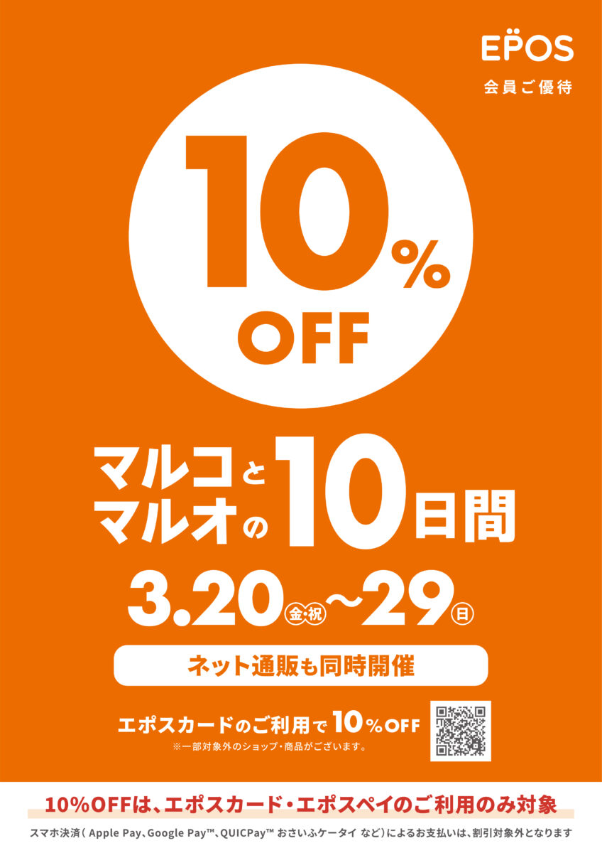 株式会社丸井(本社:東京都 中野区、代表取締役社長:青野 真博)は、2026年3月20日(金・祝)~3月29日(日)の10日間、マルイ・モディ全店およびマルイのネット通販「マルイウェブチャネル」にて、エポスカード会員ご優待キャンペーン『マルコとマルオの10日間』を開催いたします。期間中、エポスカードのクレジットでのお支払いで、10%OFFにてお買物いただけます。