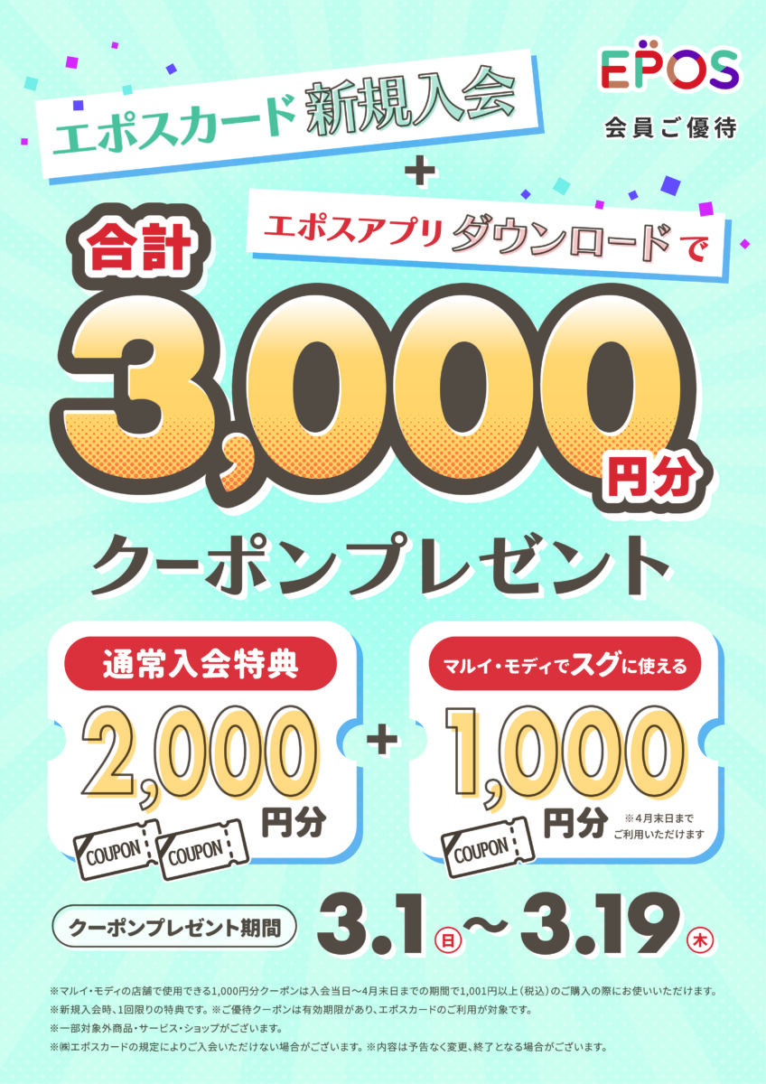 さらに、3月19日(木)までに「エポスカードに新規でご入会」&「エポスアプリをダウンロード」いただいたお客さまには、通常入会特典の2,000円分クーポンに加え、さらに1,000円分のクーポンをプレゼント!