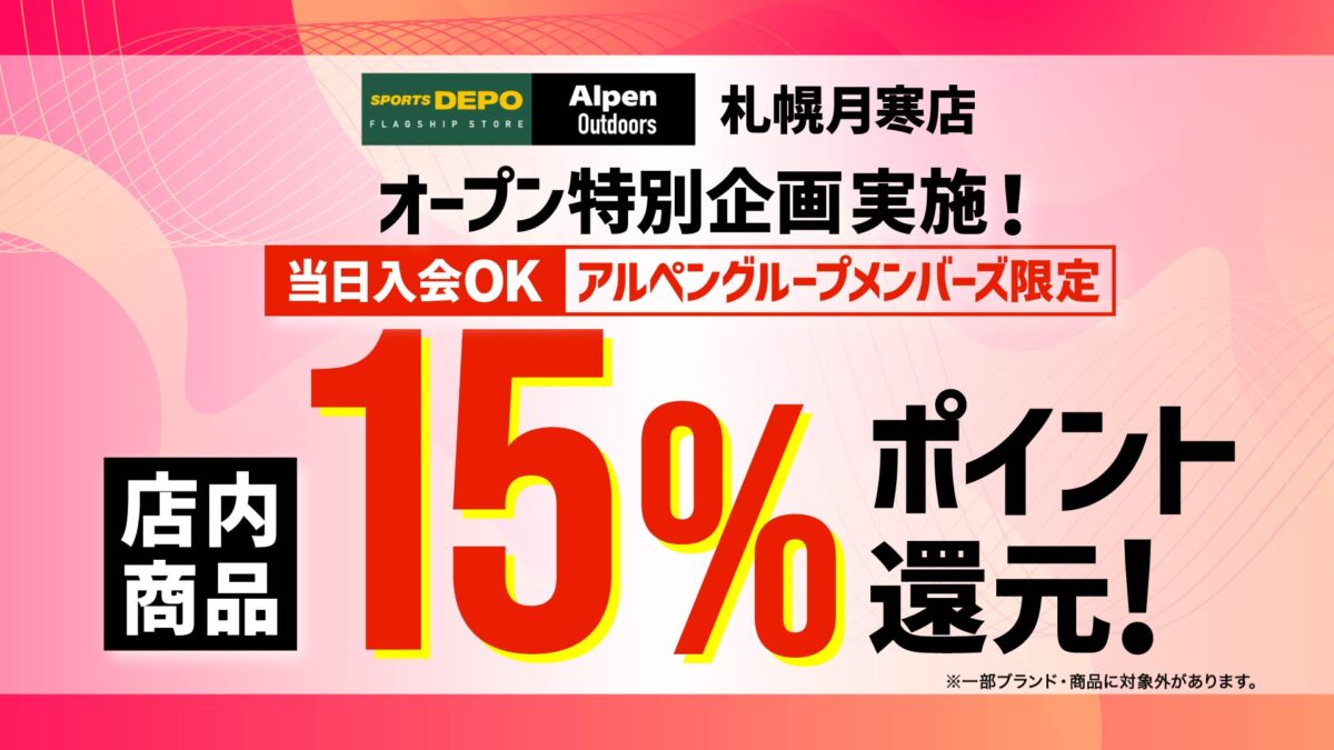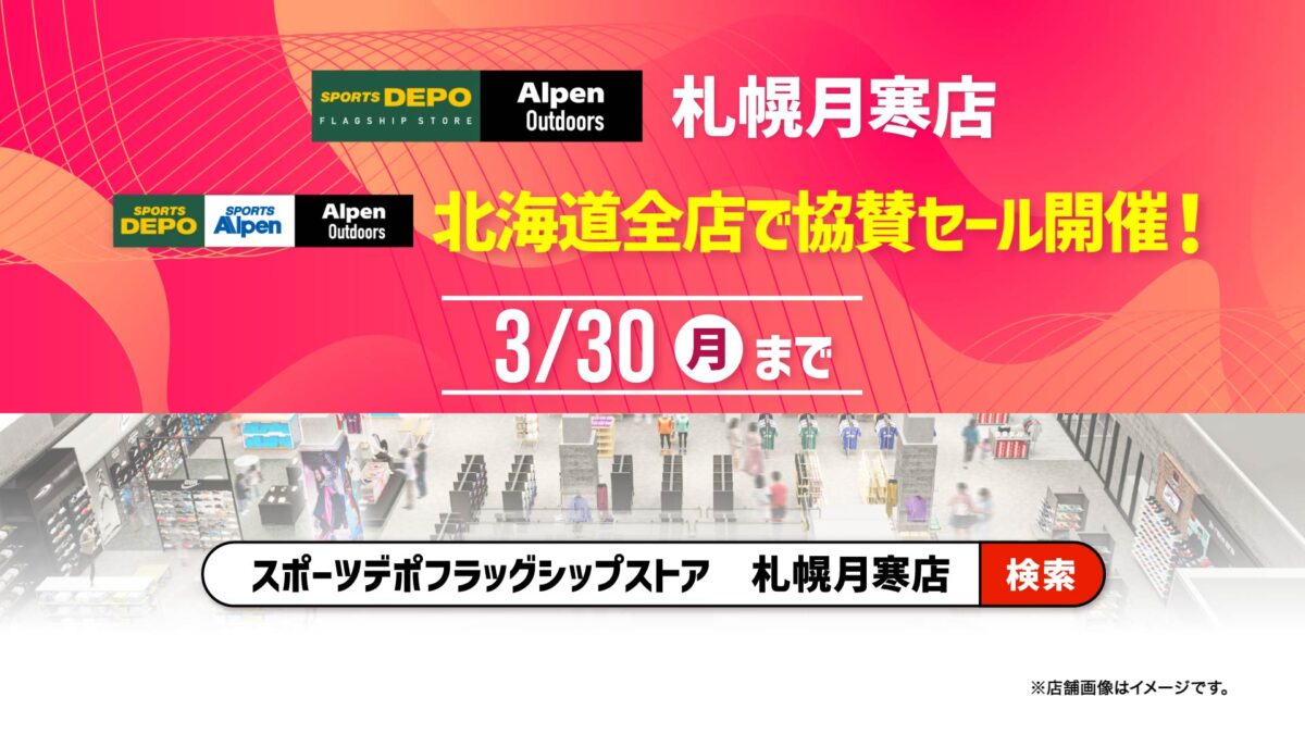 スポーツ用品販売の株式会社アルペン(本社:愛知県名古屋市、代表取締役社長:水野敦之)は、2026年3月19日(木)から3月30日(月)までの12日間、「スポーツデポフラッグシップストア札幌月寒店」と「アルペンアウトドアーズ札幌月寒店」のグランドオープンセールを核に、北海道内のスポーツデポ・アルペン・アルペンアウトドアーズ全店で協賛セールを同時開催いたします。