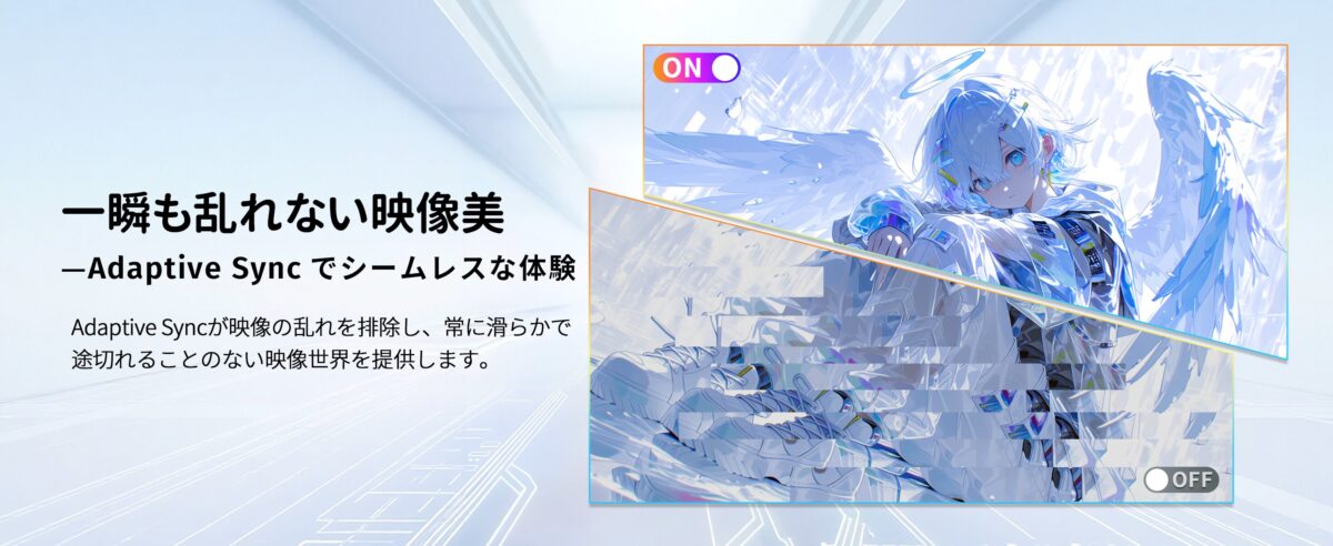 ハードウェアブルーライトカットとフリッカーフリー設計により、長時間のゲームプレイや作業でも目の疲れを大幅に軽減。集中力を途切れさせず、快適な環境でパフォーマンスを最大限に発揮できます。さらにAdaptive-Sync技術に対応し、画面のティアリングやスタッタリングを排除。すべてのシーンで非常にスムーズで没入感のある体験を提供します。