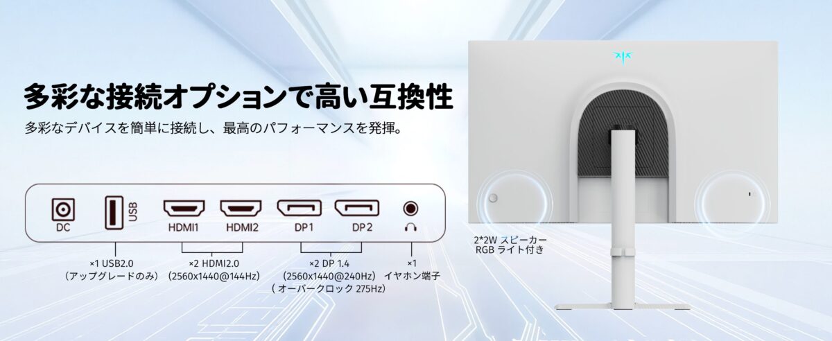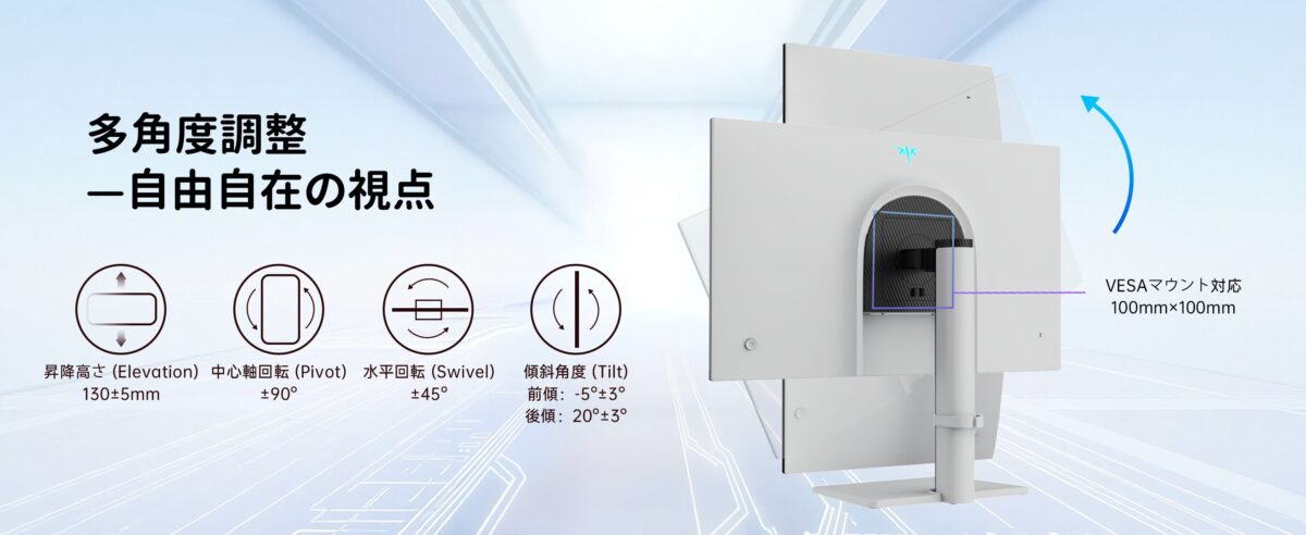 接続性も充実。HDMI 2.0×2(2560×1440@144Hz)とDisplayPort 1.4×2(2560×1440@240Hz、OC 275Hz)を装備し、PCはもちろんPS5やXbox Series Xなどの最新ゲーム機ともシームレスに接続可能です。スタンドは高低、回転、傾斜、ピボットに対応し、VESAマウントにも対応。あなたのプレイスタイルに合わせて最適な視野角を自由に構築できます。