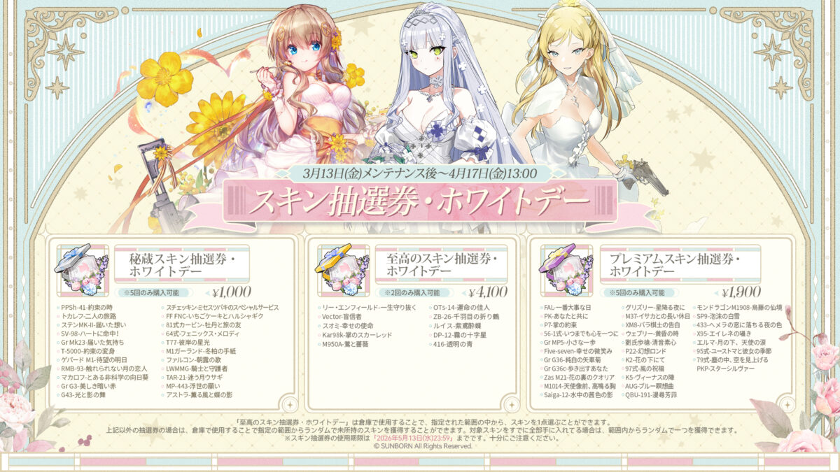 「3月13日(金)メンテナンス後」より、様々なウェディングドレススキンが入手できる「スキン抽選券・ホワイトデー」を期間限定で3種類発売いたします。