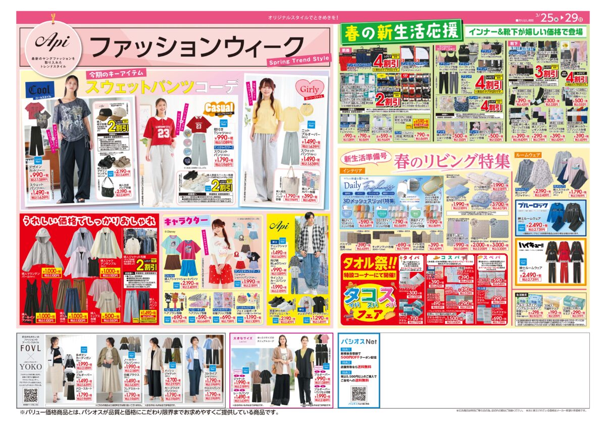 チラシ裏面では、パシオスのオリジナルスタイル(PB)[Api]のコーデや、人気インフルエンサー[YOKOさん]着用コーデをご紹介。
