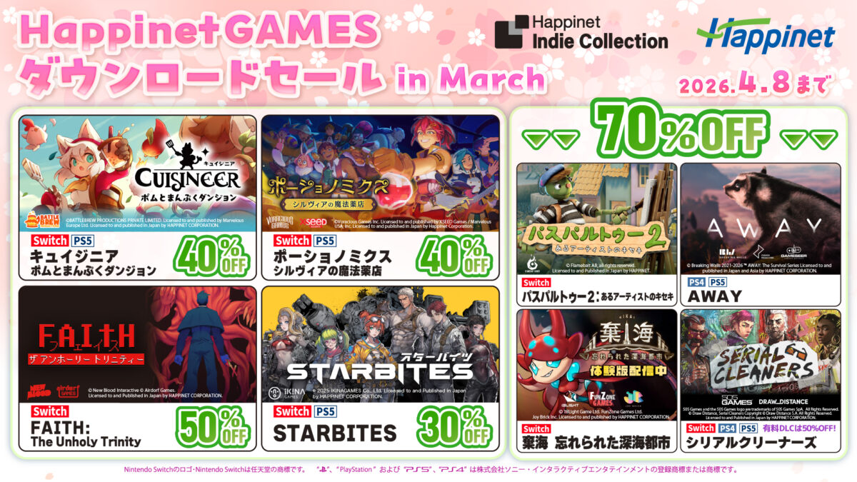 株式会社ハピネット(本社:東京都台東区、代表取締役社長:水谷 敏之、証券コード:7552)は、自社パブリッシングタイトルがお得に購入できる『HappinetGAMES ダウンロードセール in March』を、2026年4月8日(水)まで実施します。