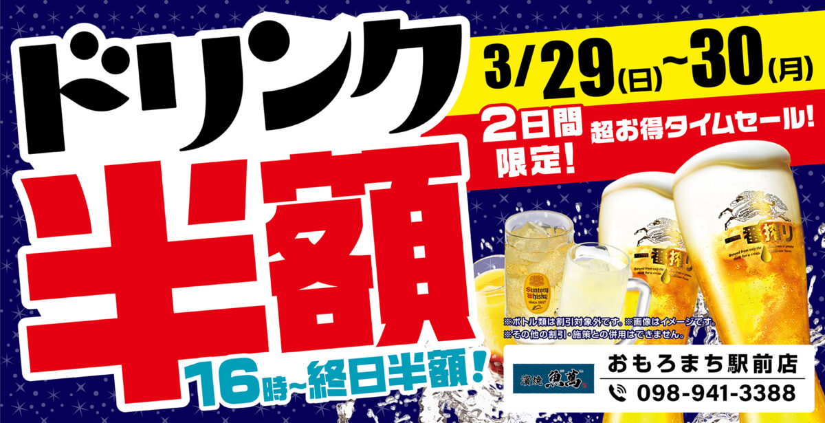3月30日(月)・31日(火)はドリンク半額!!