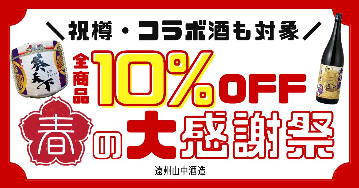 遠州山中酒造株式会社(本社:静岡県掛川市、代表取締役:山中 久典)は、日頃のご愛顧への感謝を込めて、またお花見や祝祭の場を美味しいお酒と共に楽しんでいただきたいという想いから、3月28日(土)から4月30日(木)までの1ヶ月間、公式ECサイトにて「春の大感謝祭」を開催いたします。