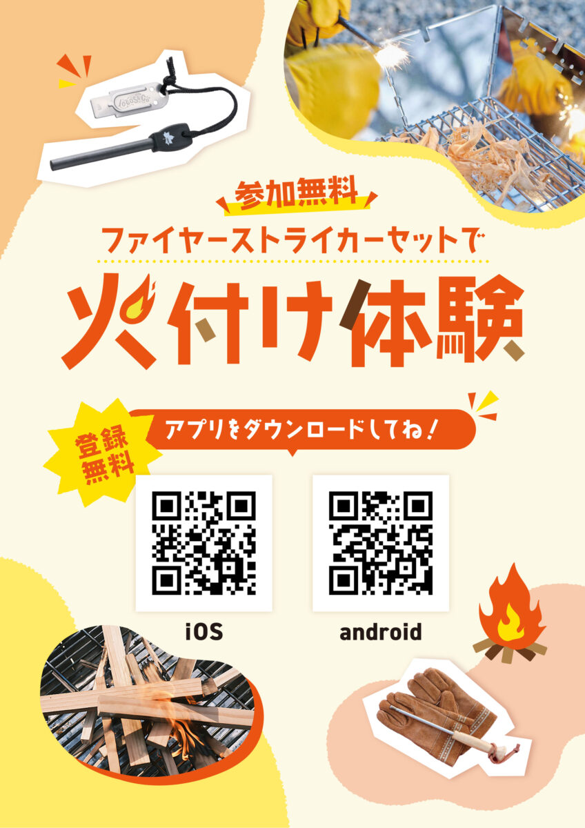 「ファイヤーストライカーセット」を使用した、火起こし体験ワークショップです。スタッフが丁寧にサポートするので、初心者の方でも安心してご参加いただけます。アウトドアだけでなく、防災や緊急時にも役立つ実践的なスキルを学べる内容です。子供から大人まで、家族みんなでぜひ体験ください。