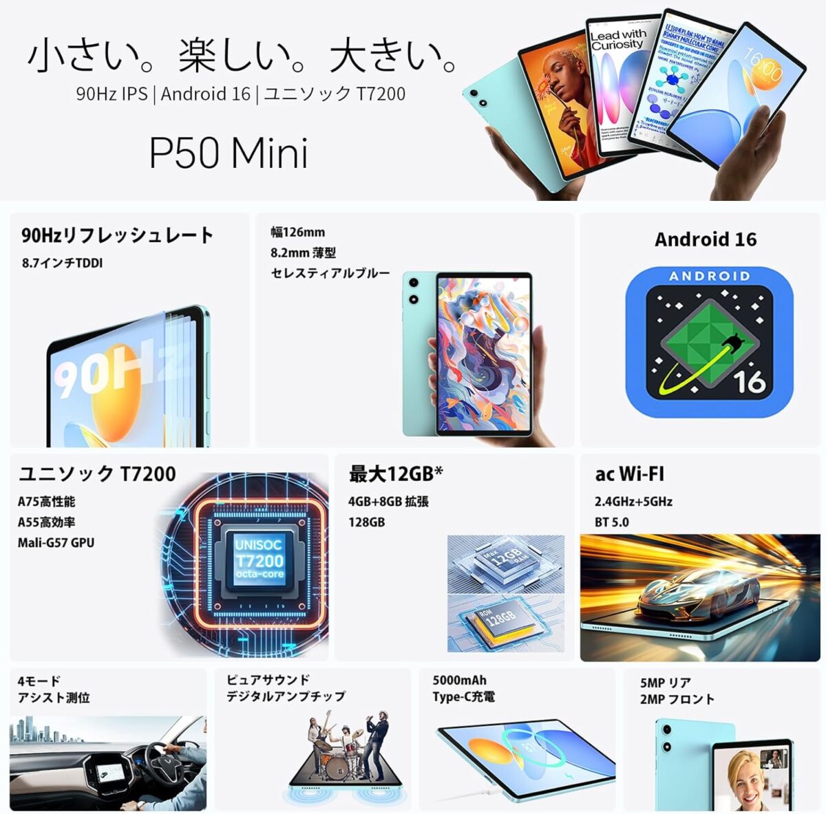 『Teclast P50Mini』は、Android 16や90Hzの高リフレッシュレートや大容量バッテリーなど、日常使いに欲しい要素をバランス良く備えた片手で握りやすい8.7インチタブレットです。仕事・勉強・外出先など、持ち歩きにも便利です。