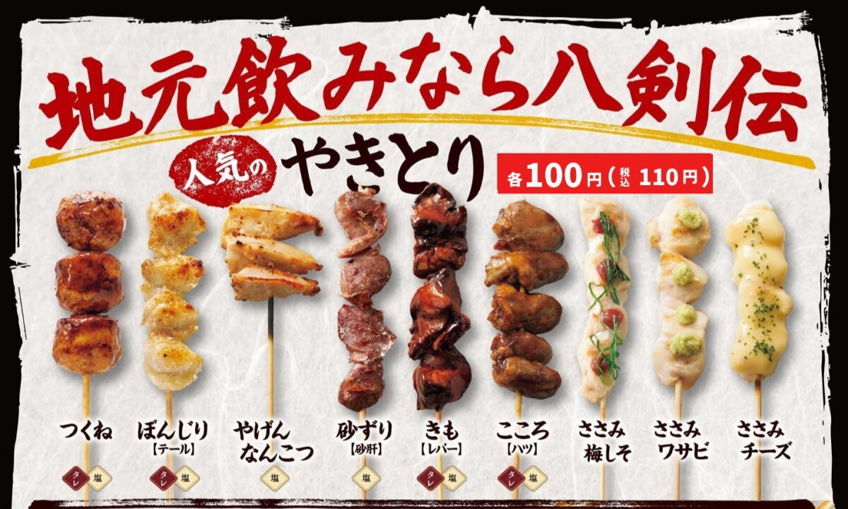 【八剣伝】毎月8日は本格炭火やきとり100円!「八剣伝の日」全国14店舗で開催
