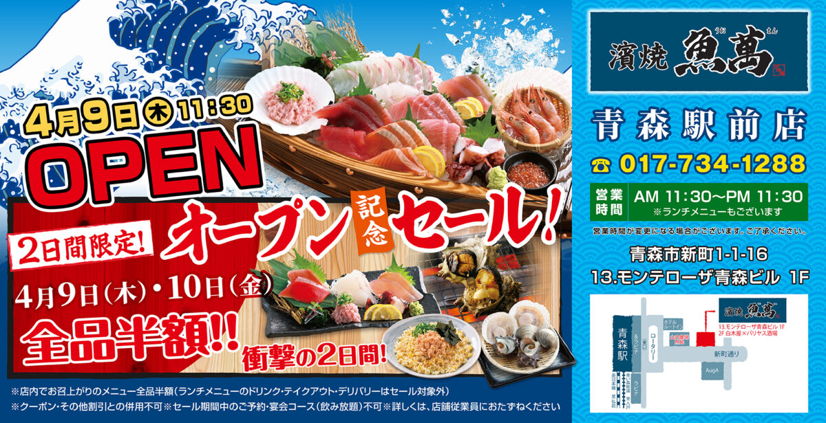「白木屋」「魚民」「笑笑」などを全国に展開する株式会社モンテローザ(本社:東京都杉並区、代表取締役:大神輝博)は、2026年4月9日(木)に「濱焼魚萬 青森駅前店」をリニューアルオープンいたします。