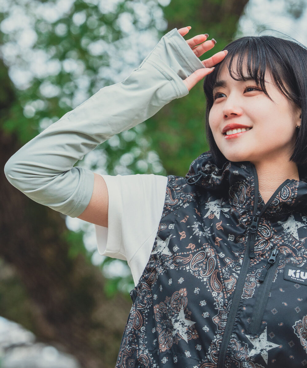 ピッタリしすぎないフィット感で日常使いしやすく、UVカット97%で腕まわりの紫外線対策をサポート。吸水速乾・接触冷感が付いており、肌に触れるとひんやりとした感覚に。親指が入れられるサムホールでしっかり手の甲までカバー。