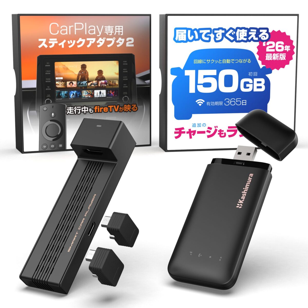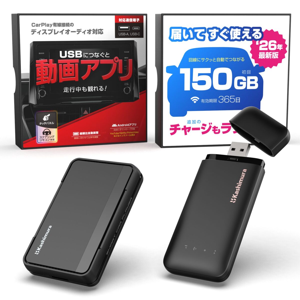 カシムラでは、そんな同乗者さんの退屈や不満を解消するため、移動中の車内でも動画配信サービスを思い切り楽しむことのできるガジェットとWi-Fiルーターのセットを2種類ご用意しました。