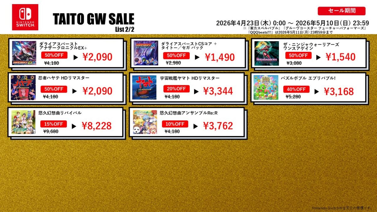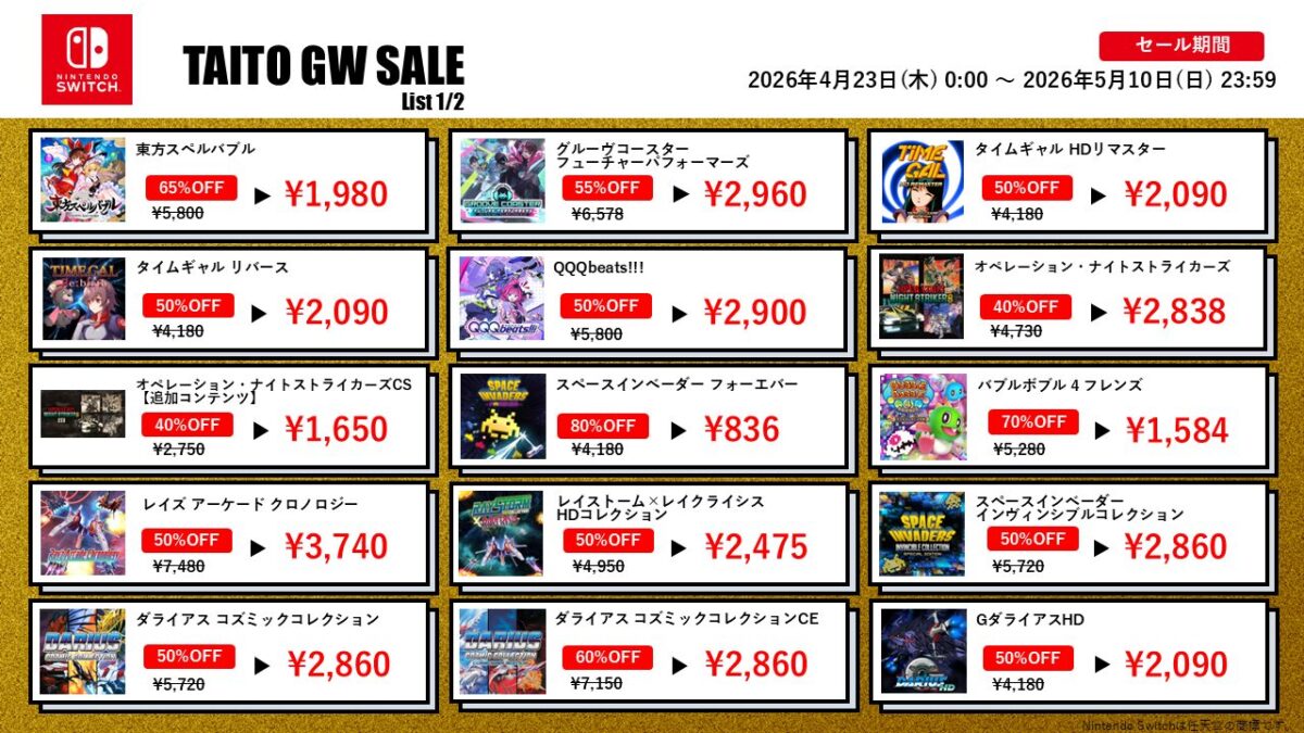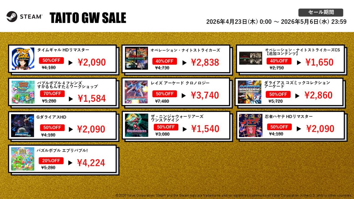 株式会社タイトー(本社:東京都新宿区、以下タイトー)は、対象のダウンロード版Nintendo Switch™用ソフトやSteam用ソフトが最大80%オフとなる「タイトーGWセール2026」を実施いたします。