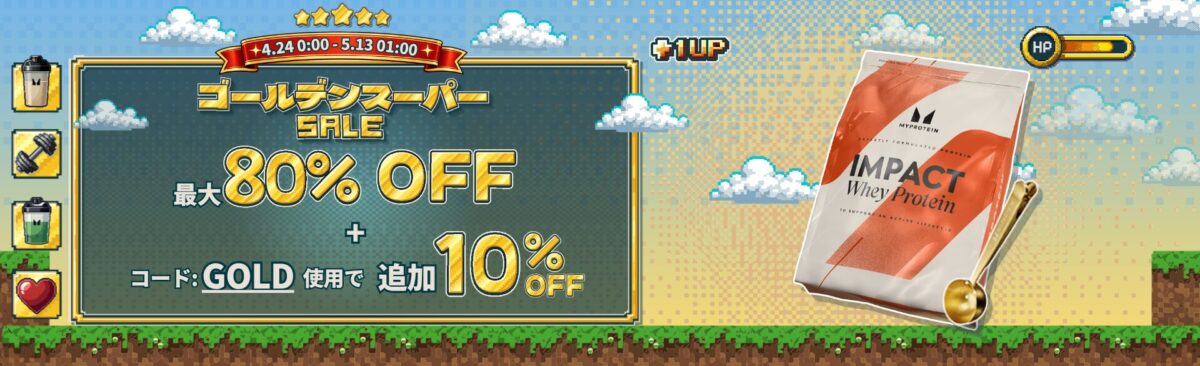 ヨーロッパNo.1スポーツ栄養ブランド*「マイプロテイン」(会社名:THG Nutrition Limited、本社:Manchester, United Kingdom、CEO:Neil Mistry)は、2026年4月24日(金)0時00分から5月13日(水)1時00分まで期間限定で、豊富な商品が最大80%OFFとなる上半期最大級のセール『ゴールデンスーパーSALE』をマイプロテイン公式サイトにて開始いたしました。セール開幕に合わせ、今だけ楽しめる数量限定の商品ラインナップを展開しています。また、公式サイトでは、購入金額に合わせてクーポンがもらえる「パワーアップキャンペーン」(5月1日(金)0時まで)、公式Xでは、リポストの数に合わせて豪華プレゼントがアンロックされる「HPチャージチャレンジ」を開催中です。