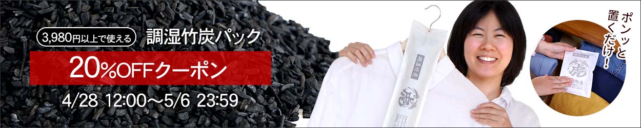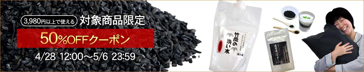 2026年4月28日(火)正午~5月6日(水・祝)23時59分まで、3,980円(税込)以上購入で先着300名様に竹炭スティック2本を進呈!さらに対象の竹炭商品の最大半額クーポンなどGW限定特典も!