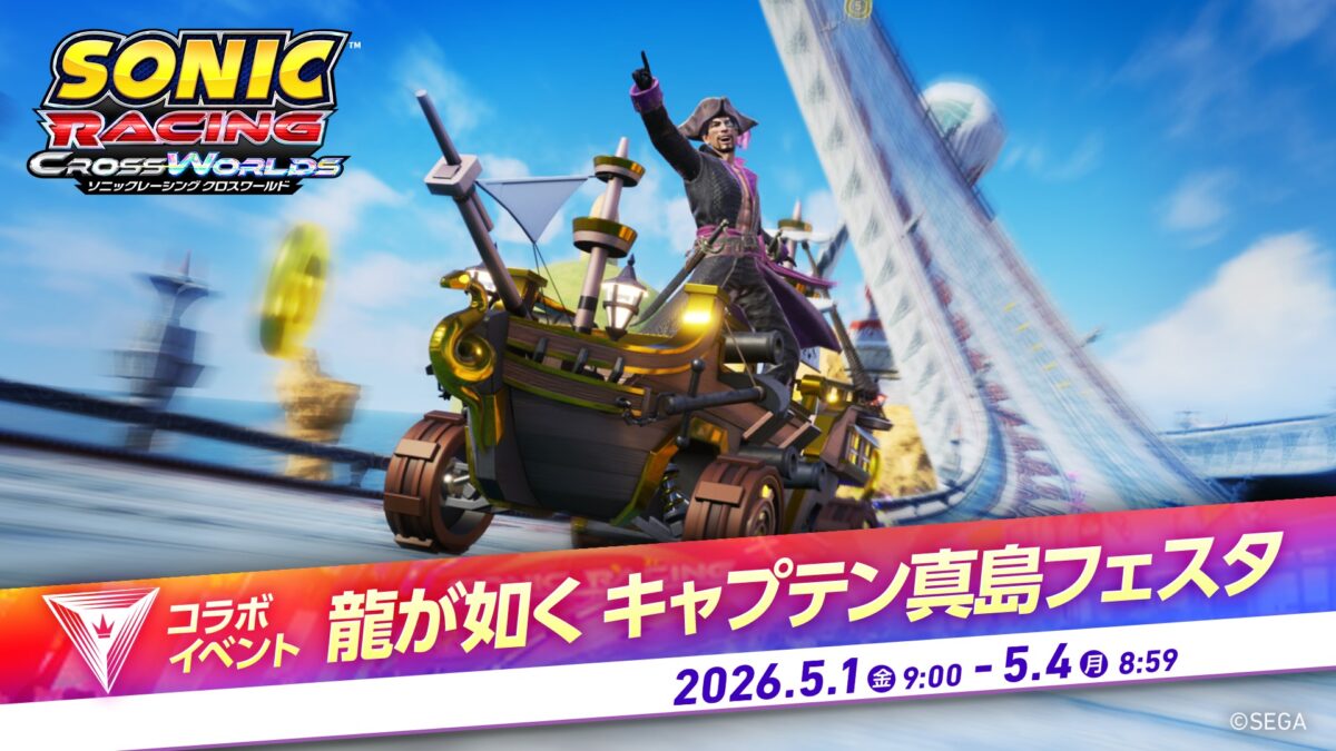 株式会社セガは、発売中の『ソニックレーシング クロスワールド』について、無料アップデート「真島吾朗(キャプテン真島)(『龍が如く』シリーズ)」の配信を2026年4月30日(木)より開始することをお知らせいたします。また、5月1日(金)より期間限定のコラボイベント「龍が如く キャプテン真島フェスタ」を開催予定です。イベント期間中にフェスタポイントをためると、コラボイベントならではの特別なゲーム内アイテムが手に入ります。