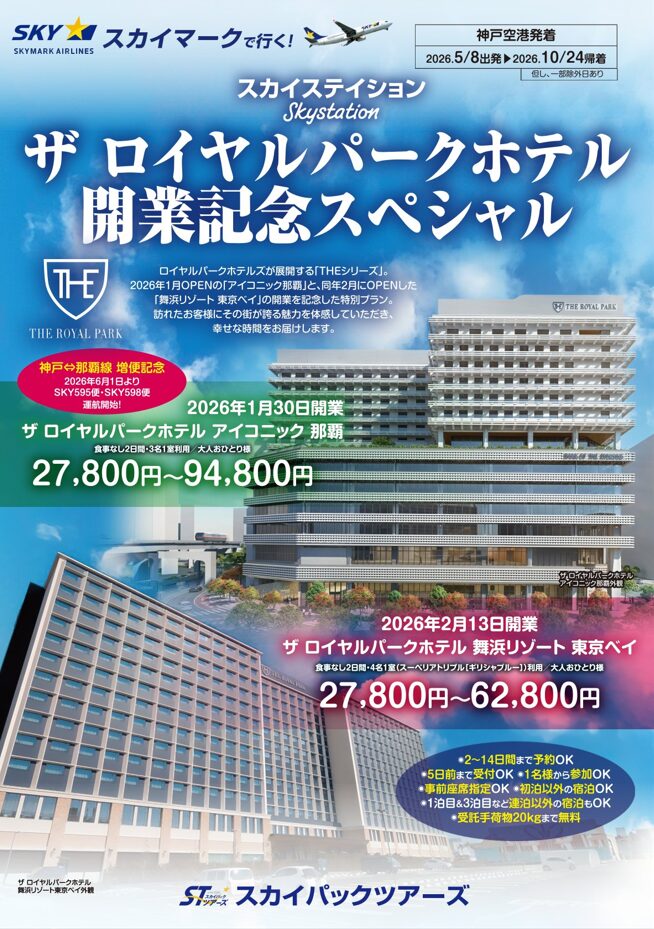 スカイパックツアーズ株式会社(本社:東京都中央区、社長:横山正巳)は、スカイマークの航空券とホテルがセットになったスカイマーク公式・旅行商品(ダイナミックパッケージ)『たす旅』にて沖縄・那覇『ザ ロイヤルパークホテル アイコニック 那覇』、千葉・舞浜『ザ ロイヤルパークホテル アイコニック 那覇』のSpecialクーポンSALEを開始しました。